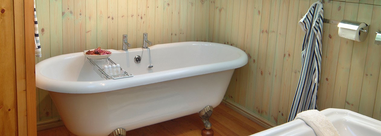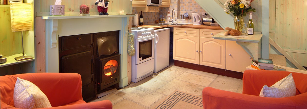 The open plan lounge / kitchen features warm wood panelling and a stone floor. Upstairs is a cosy double bedroom and on the second floor you will find a modern bathroom complete with roll-top bath.