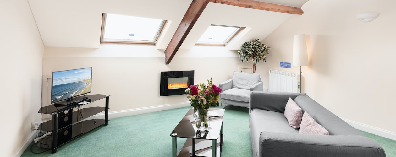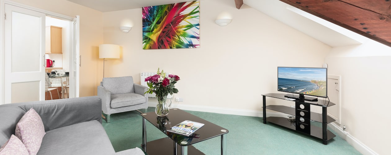 Royal 9 is a 2 bedroom apartment boasting a beautiful sea view, located in our cliff top Royal building. It sleeps up to 4 people in its 2 bedrooms, bedroom 1 is a double and bedroom 2 is a twin. As well as having a large open plan living and dining area.