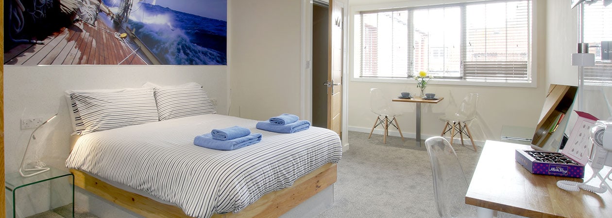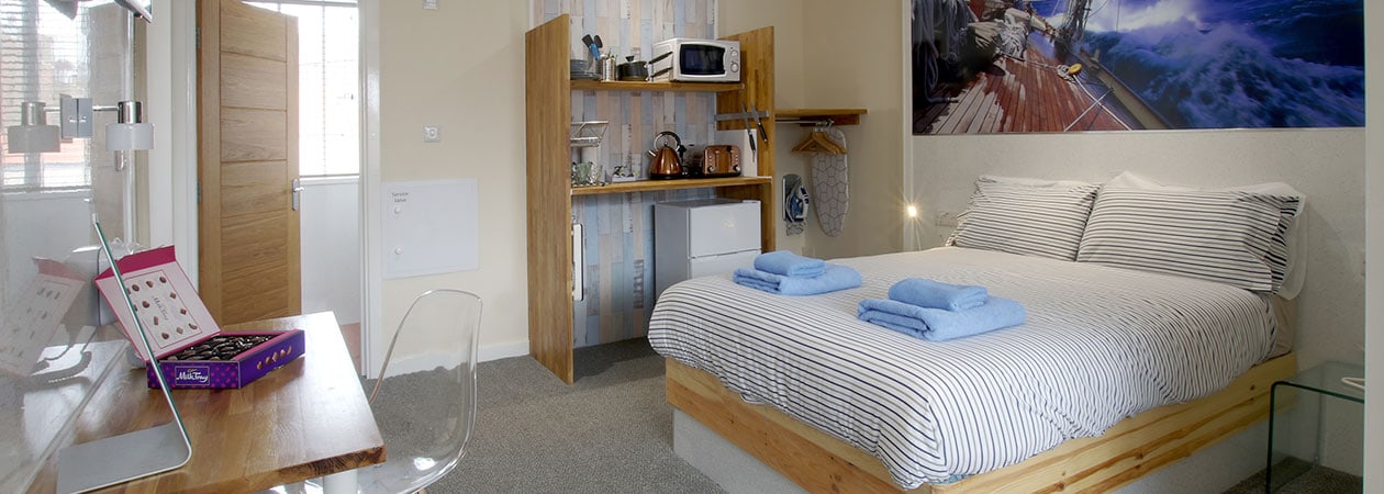 Silver Street Suites 8 is a cosy and contemporary mini suite room. These rooms are a studio style apartments with small kitchenette, dining and seating areas. Situated centrally in our Silver Street Suites building.